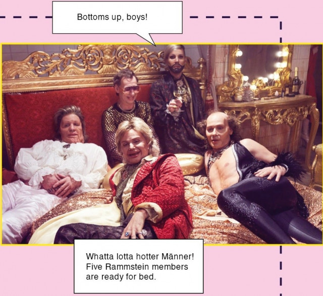 Бляяя, раммштайни і їхні підписи! Bottoms up – це ще одна гра слів, це означає "випити до дна", але також це популярна серед геїв фраза, ну і означає вона що означає, дослівно. І ці п'ять гейчіків готові. Хоча Пауліна не сильно задоволена. Милота – Пауль замінив свої звичні сережки-колечки на гламурні сережки.