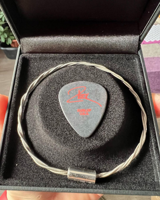 Але Бог з ним, з браслетиком. Чому медіатор сірий? Звідки взялися сіренькі медіатори? У 2017 році в коробочки вкладали червоні медіатори, з 2019 року – чорні з червоним лого. Сірих ніколи не було, і Ріхард не користується сірими. І сама коробочка завжди була чорна. Чорне і червоне, кольори Ріхарда. Тепер коробочка сіра, медіатор сірий – це що за зміна концепції? Це щоб до сірого костюмчика пасувало? https://www.instagram.com/p/Cf3okVtoRNp/
