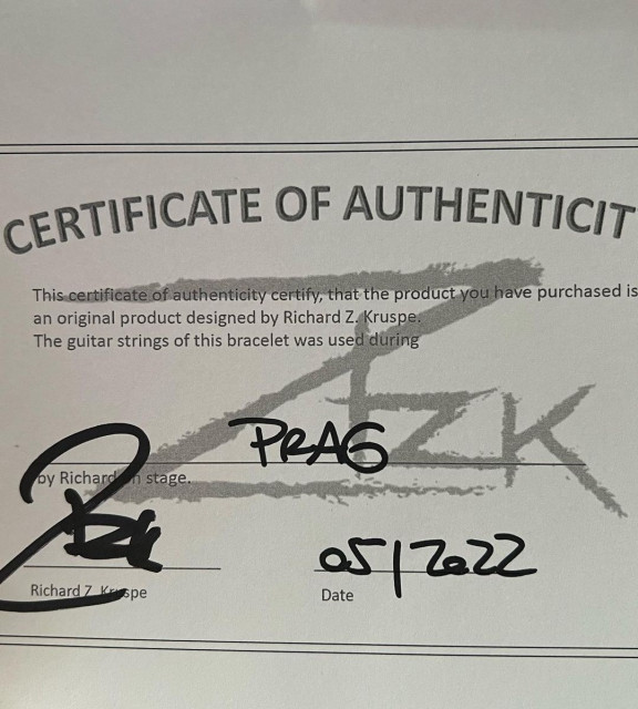 Народ почав купувати нові струнні браслетики Ріхарда. Я дуже вибачаюсь, але чи дійсно вони нові? На застібці метал пошкрябаний, наче цей браслет десь валявся і терся об щось. Або цей браслет насправді – розпродаж залишків туру-2017, або нову партію роблять халтурно. Що геть не схоже на Ріхарда-перфекціоніста. А якщо він не контролює – йому геть не цікаво, як роблять його струнні браслети. Хоча карточки він сам виписує. Цікавий у Ріхарда зараз почерк – взбалмошний, як Королева Круспе, він раніше так не писав. До того ж він написав німецький варіант назви міста, Ріхард не перший раз забувається і використовує Prag замість Prague.