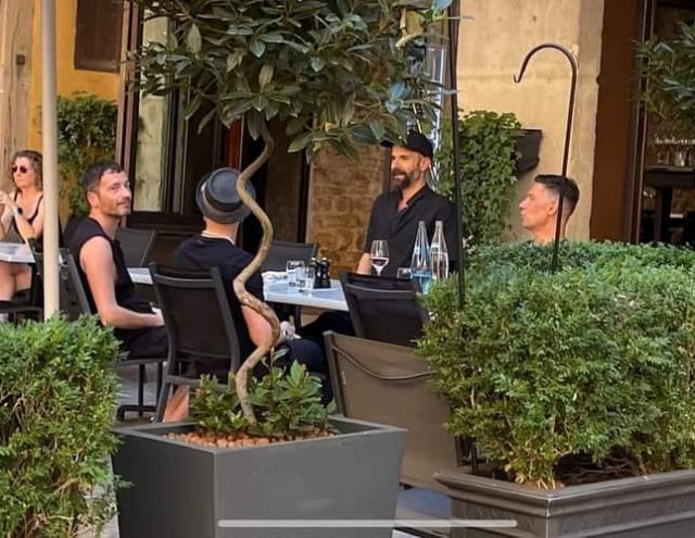 Мужик, фото якого я постила вчора, виклав наступне фото з серії "кафешка". Я не зрозуміла, перед Оллі бокал з вином чи що? Кох замученим виглядає. І перли. На що не дивись - око все одно повернеться до перлів.