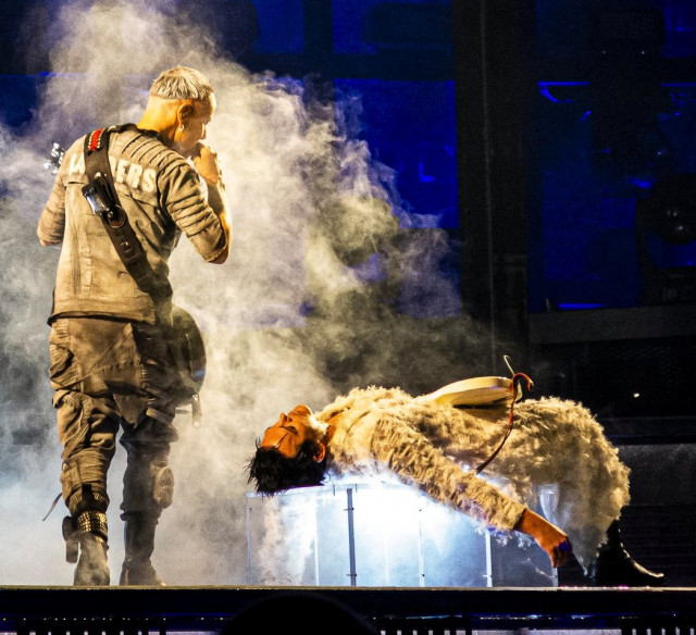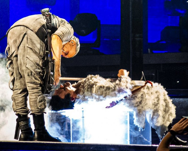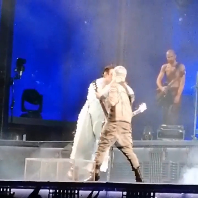 Тепер герр гітару загубив. Точніше, він її спеціально зняв. Після соло МТ зняв гітару, поклав її на пол, а сам став проходжуватися як павич по своєму кутку сцени. Герр повертає собі амплуа гордого Орла?