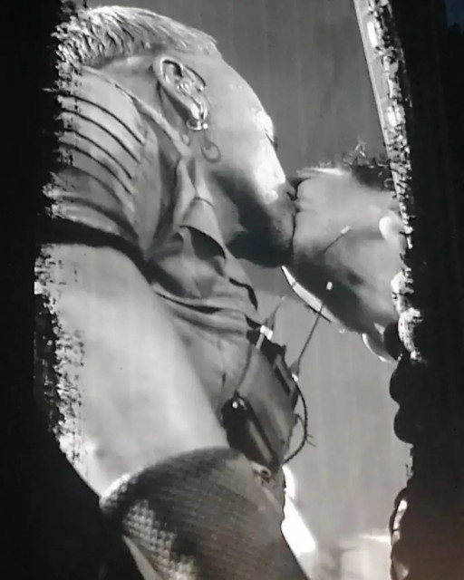 А поки баби будуть обговорювати такі речі, гітаристам буде чим зайнятися. Вчора побачила це фото, але через роботу і приступ мігрені не було сил його запостити. Перший Талліннський аусландер-кусс у всіх анатомічних подробицях. Гітаристи серйозно відносяться до куссу, не махлюють і халтуру не роблять. Якщо вже цілуватися – то по-справжньому, засосавши губи герра і обмазавши його слинками.