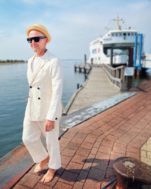 Ох який герр красень, от тепер точно як джентльмен вікторіанської ери на морському курорті. Цей костюм шикарно виглядає з босими ногами. Правда, після ходіння босоніж п’ятки герра перетворяться на копитця, але то таке, всі звикли. Герр задоволений і думає про щось приємне, бо з опущеними очами посміхається своїм думкам. Що у нього за спиною, він щось у руці тримає на рівні бексайду? А бексайд продовжує округлятися, такими темпами герр скоро даму догонить. На пам'ять про відпочинок герр причепив собі на лацкан значок-емблему порому. Морячок. Пауль собі оновив тату на шиї чи це ретуш на фото?