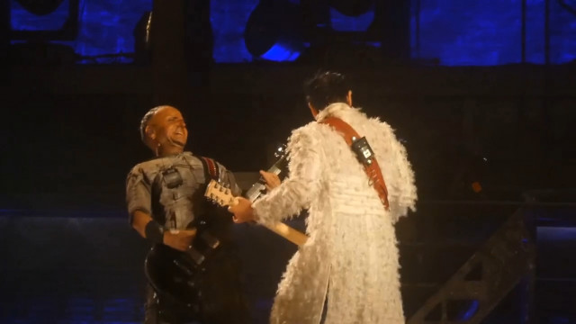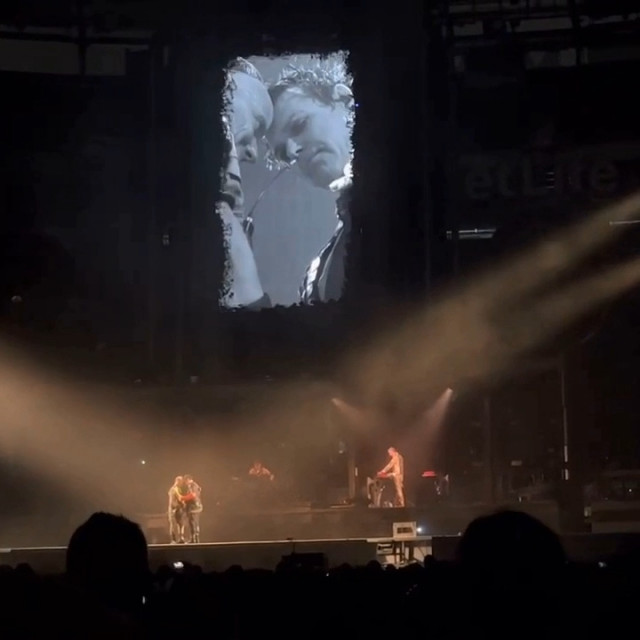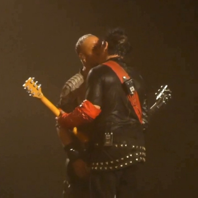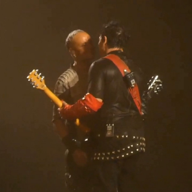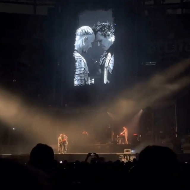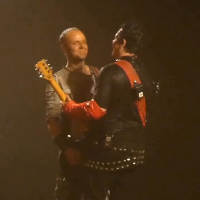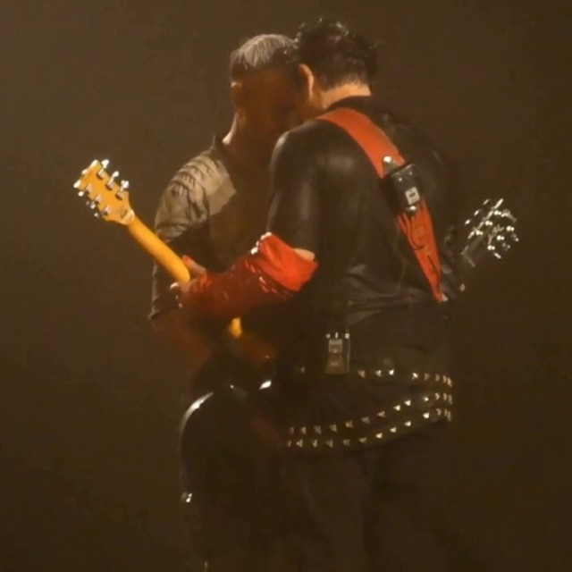 Повний Аусландер-кусс. Він такий зворушливий. Знову Ріхард став грати свій новий варіант соло, і цього разу Ріхард повністю погрузився в свою музику. Пауль пішов на сходку як тільки почув, що Ріхард почав грати своє. Прийшов на середину сцени і став чекати на Ріхарда. Ріхард пішов лише тоді, коли дограв свою варіацію соло. Дограв своє, почав грати те, що треба, розвернувся і швидко пішов до Пауля. Пауль чекав на нього, і вони відразу, як тільки Ріхард підійшов, стулилися лобиками. Пауль нахилив вперед голову, і Ріхард як дійшов, притулився до неї. Стулилися лобиками і стояли так, фінішуючи соло. Це така душевна мить. Пауль підняв очі і посміхаючись дивився на Ріхарда, а Ріхард весь віддався миті, аж потім Ріхард глянув на Пауля і став посміхатися. Яка чудова ілюстрація гітаристів: Ріхард перебуває у власному світі, а Пауль любується Ріхардом. Як справно і легко пальчики Ріхарда порхають по струнах, який він талановитий і дійсно не від світу цього. Реакція Пауля цілком природня – поцілувати це прекрасне створіння. Міцно-міцно поцілувати https://www.instagram.com/p/CiMXYdhsx15/