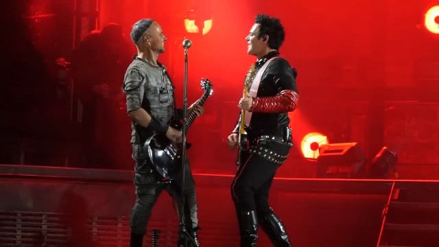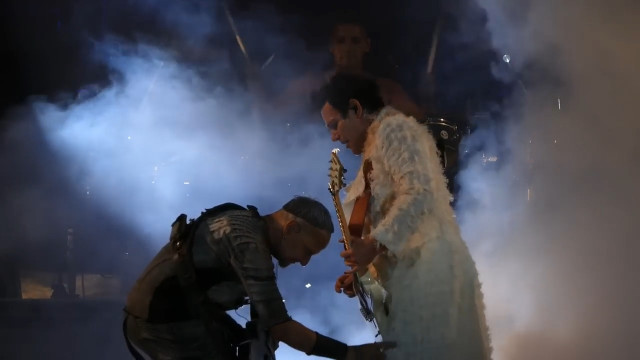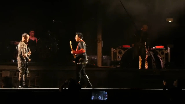 Гітаристи являють собою разючий контраст з Тіллем – тверезі та зібрані. Після того, як я вчора весь вечір вивчала кліп Тіттен, дама на сцені навіть не сильно шокує своїм макіяжем, порівняно з макіяжем файнес фройляйн макіяж норм, вій повій немає… і тут я піймала себе на думці, що якщо я абсолютно не можу уявити Ріхарда на сцені з червоною пов’язкою, я дуже легко можу уявити Ріхарда на сцені в образі файнес фройляйн. Якби Ріхард вийшов на сцену в шовковій сорочці під плащем – це виглядало б доречно й гармонійно. Реально, це саме той концертний одяг, який потрібен дамі – шовкова сорочка. Вона ідеально вписалася б усе те, що дама робить на сцені.