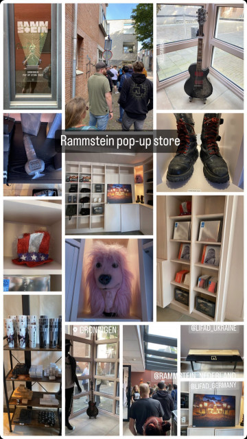 Виїзний раммшоп відкрився, фани там скупляються, все мирно і прилічно, черга радує око – треба ж Хазяйці й Хазяїну трохи заробити, щоб компенсувати відмінені робочі дні раммшопу. З Берліну привезли не лише товар, а й лавочку та експонати з рамм-музею. Щодо товару – першим кидається в очі хуйове мило, не найкращий товар для нинішніх часів, але це ж Раммштайн.