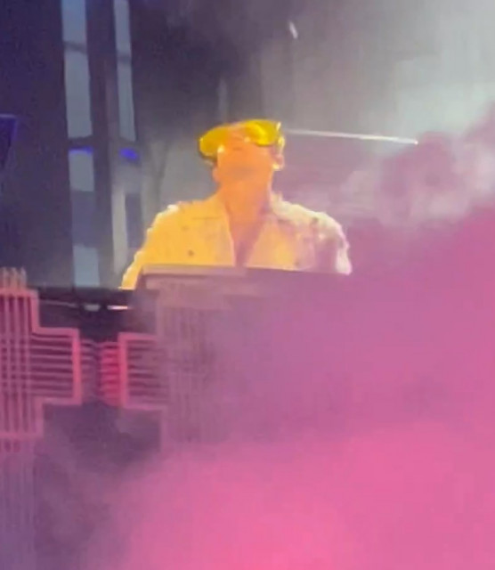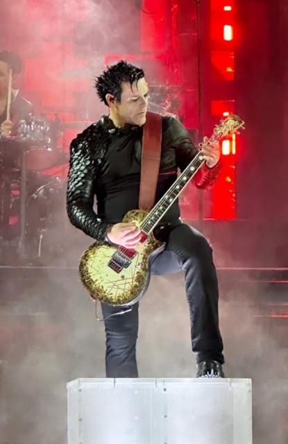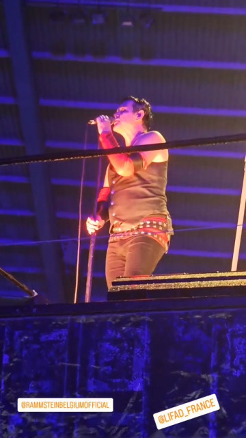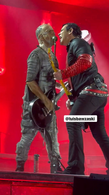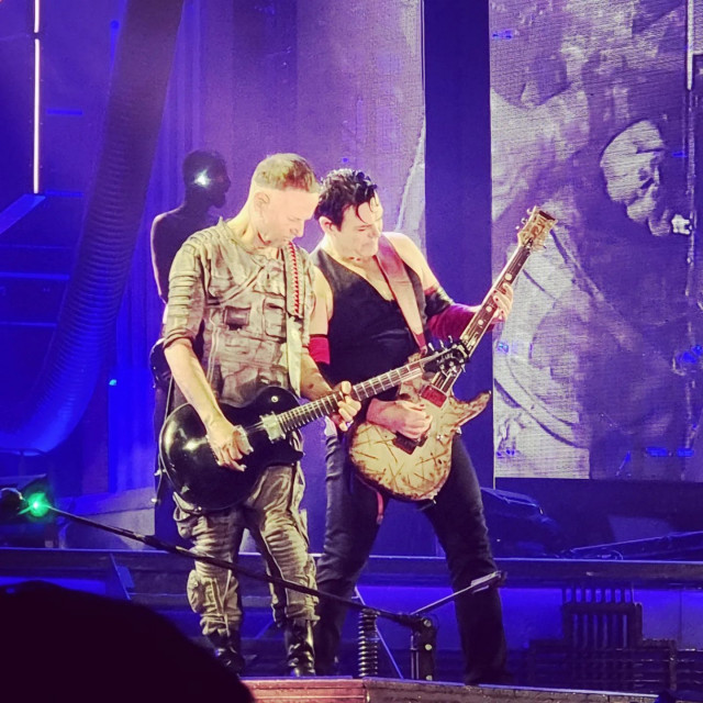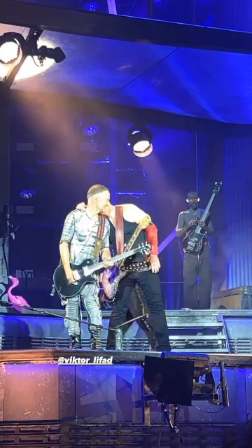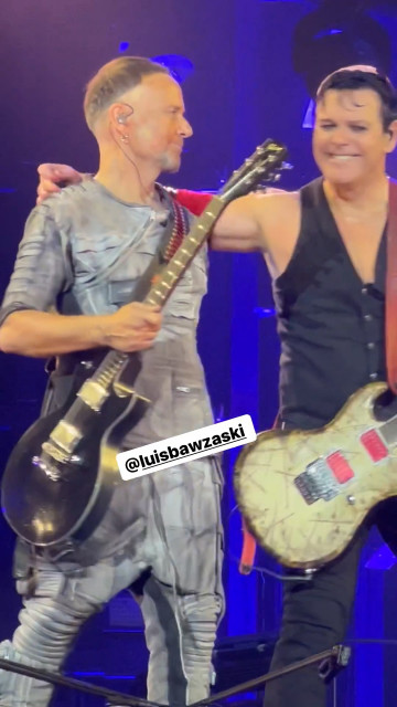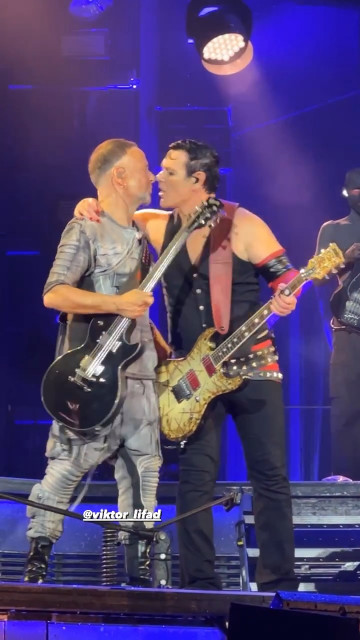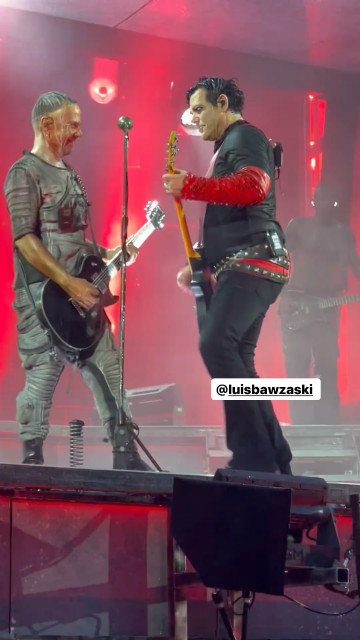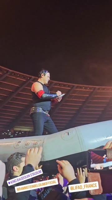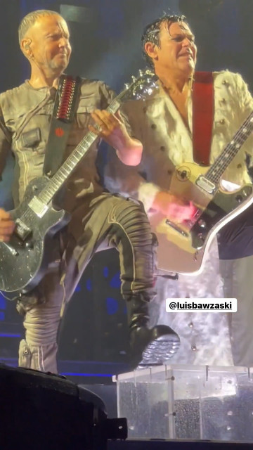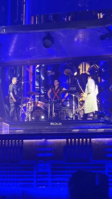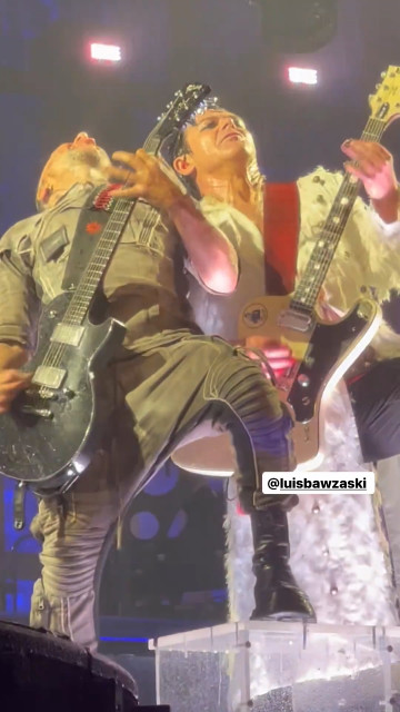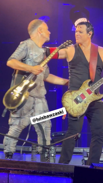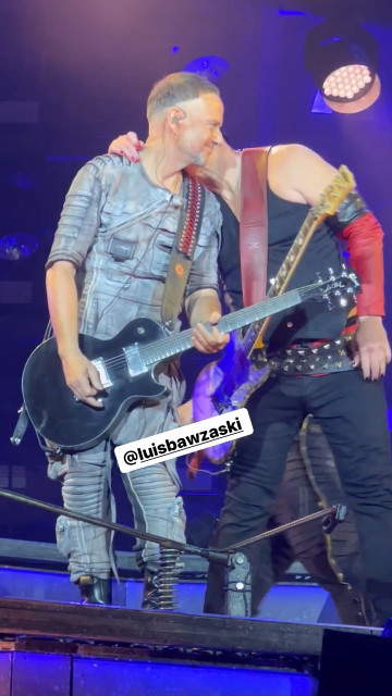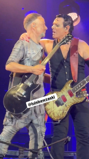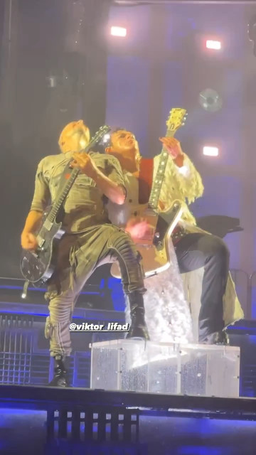 Коли гітаристи переводили Радіо в МТ, Тілль цього разу чіплявся не до Пауля, а до Ріхарда – підійшов до Ріхарда й став перед ним, виставивши руки. Але Ріхард вибрався з пастки й попрямував до Пауля. Гітаристи стали на підставку, герр став нахилятися назад, і дама послідувала за ним – це нагадало, як вони у Празі-2019 робили мостики назад. Тут те ж саме, причому при дощі, який у такій позі ллє прямо в обличчя. Фінішуючи соло гітаристи розвернулися один до одного https://www.instagram.com/p/CvlCvH-N1UD/