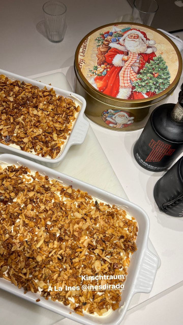 Судячи зі сторіз баби Лукас, вдень сімейство Круспе з друзями обідали в готелі Адлон Кемпінскі, потім гуляли по місту, а ввечері догружалися вдома десертом і текілою Раммштайн. Ріхард молодець, він уже взагалі алкоголь не купує, тільки безкоштовний товар з власного раммшопу. Десерт зроблений із запечених мигдалю, сиру й вишень. Як не чорника, так вишні, люблять на даху ягоди.