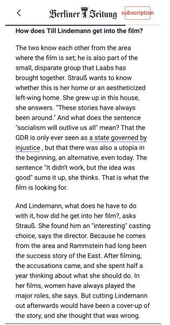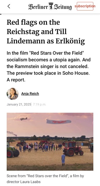 Лівацька утопія про соціалізм - якраз кіно для Тілля. Флаке щасливий за кореша. Німці реально ідіоти і не можуть зрозуміти, що соціалізм є таким же злом, як і нацизм? «Це не спрацювало, але ідея хороша». Та блять да, зашибись ідея, давайте ще один експеримент з концтаборами та голодоморами влаштуємо, чого хорошій ідеї пропадати. Режисерці 39 років - дура, яка не жила тоді та дрочить на ілюзію https://www.berliner-zeitung.de/kultur-vergnuegen/kino-streaming/rote-fahnen-auf-dem-reichstag-und-till-lindemann-als-erlkoenig-in-rote-sterne-ueberm-feld-von-laura-laabs-li.2290525?fbclid=IwZXh0bgNhZW0CMTEAAR2NocX_qNYqYbS_lKVAO7BOQNVuN95b9W-bv22Sz2yPUebWHytiBxlTE2U_aem_IrMmn1IOYXtZ15FJ62R0Pg