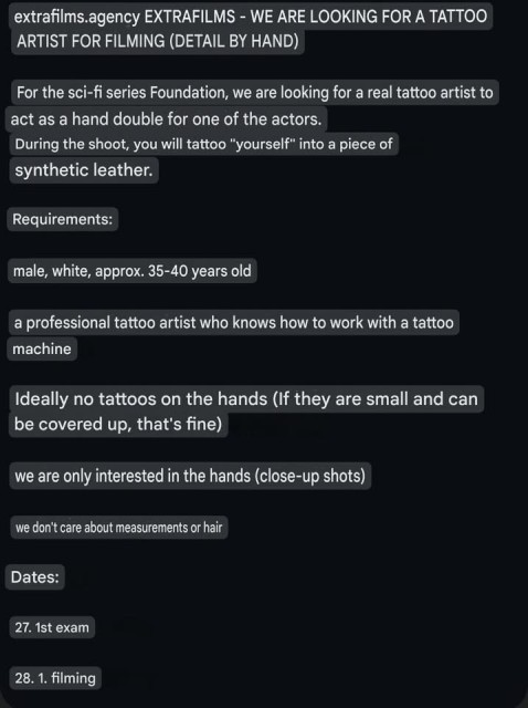 Вони шукають тату-майстра, руки якого з’являться в кадрі замість рук актора, щоб зробити самому собі тату – звісно, фальшиве, на синтетичній шкірі.