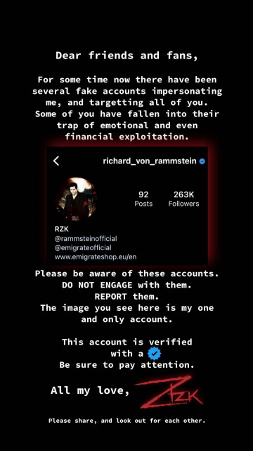 Бляяя, Ріхард фон Раммштайн. Він навіть ахтунг "бережіться фейкових акаунтів" не може написати як колишній Ріхард, навіть у такому проступає дєвочка-бегонія. Оця примітка внизу маленькими буквами: "look out for each other" – це такий нинішній Ріхард, давайте любити і піклуватися один про одного… Як Ландерс з написом на всю спину, так Ріхард із загальною любов'ю. І сам Ріхард усіх любить. Вибачте, не Ріхард, а RZK.