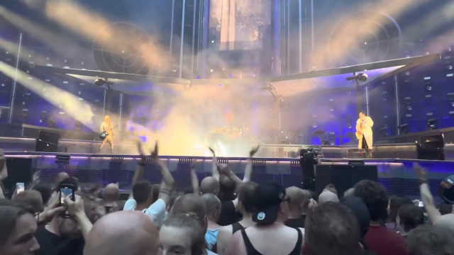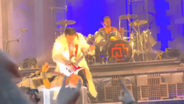 До цього фото у мене питання. Рожеве на щоках герра – то відблиск від чогось чи герр почервонів під своїм гримом? Це фото зроблене відразу після соло МТ, коли Тілль викочує котел.