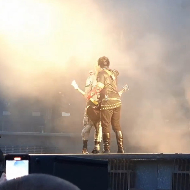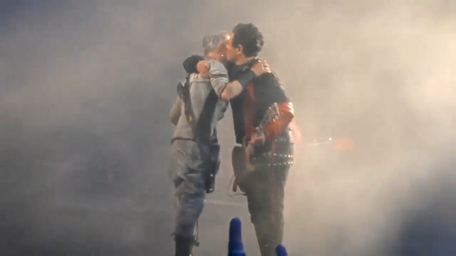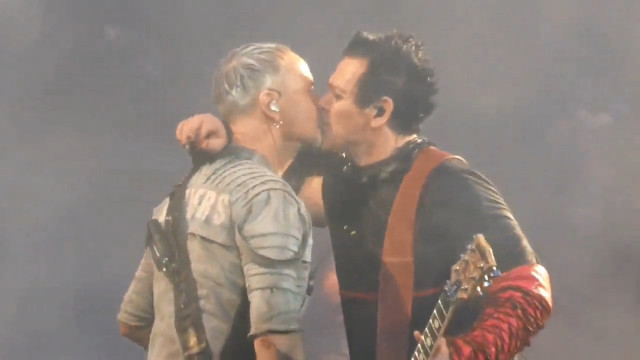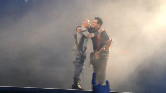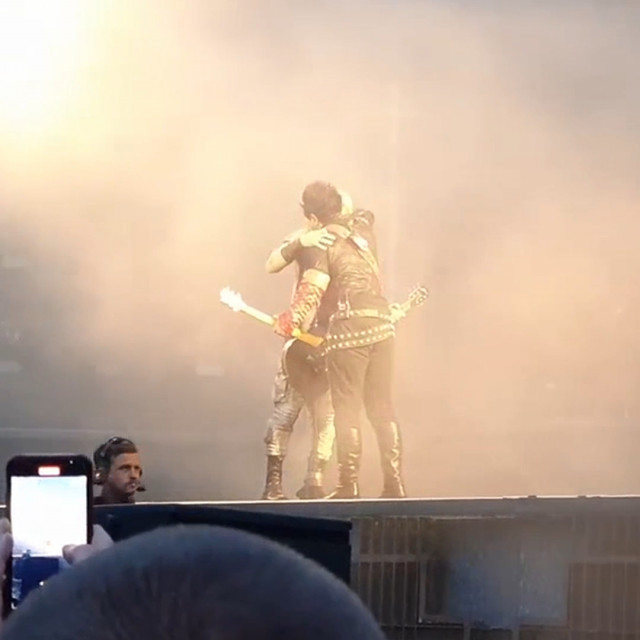 Перед куссом Тілль знову робив членомікрофон, на цей раз посеред сцени. Розіграв цілу пантоміму – і що кончив, і що в нього не стоїть, і просі ужимки придурка. Потім став дзвонити своїм придурочним дзвоником, але після поцілунку він дзвоником не розганяв гітаристів. Гітаристи на нього ніякої уваги не звертали. Обличчя Ріхарда видно дуже добре: коли задзвонив дзвоник, він абсолютно не прореагував, оком не кліпнув, вся його увага повністю сконцентрована на Паулі. Ріхард дивився не Пауля, а потім посміхнувся і потягнувся цілуватися. Поцілувалися швидко: ротик Ріхарда був закритий, Пауль, який теж широко посміхався перед поцілунком, присосався до нижньої губки Ріхарда, очі цього разу не закривали. Коли розліпилися – Ріхард звично влігся на плече Пауля. І тут ахуй – вираз обличчя Ріхарда. Він лежить посміхається, коли Пауль обнімає його, а коли Пауль став м’яти йому плечико – він закрив очі, і вираз обличчя у нього став… ну так виглядає кошенятко, коли його гладять, він зараз замуркоче. Ріхард поцілував щоку Пауля, і потім Пауль продемонстрував, що він не геть калюжка – долоня Пауля на плечику Ріхарда легенько штовхнула Ріхарда, наче Пауль подав сигнал що все, завершуємо. Правда, розходитися по своїм місцям гітаристи не спішили, але розліпилися. Таки Пауль ще може командувати Ріхардом.