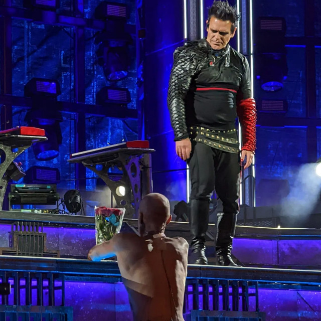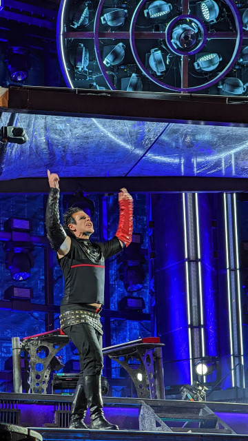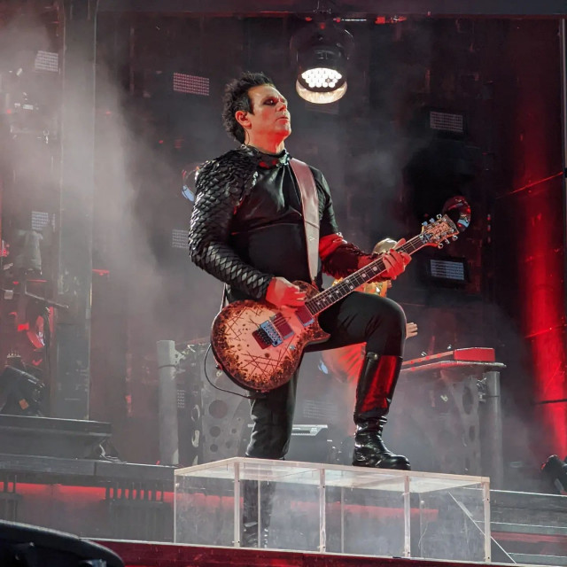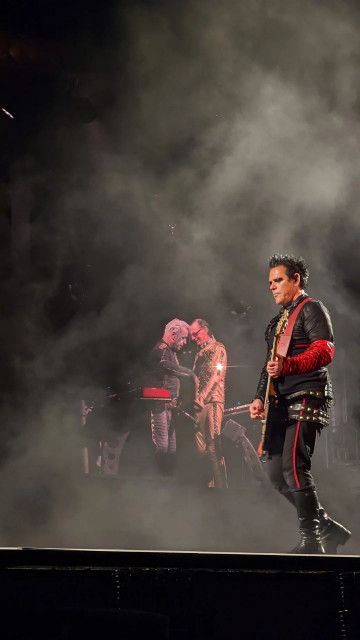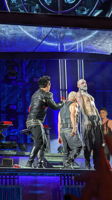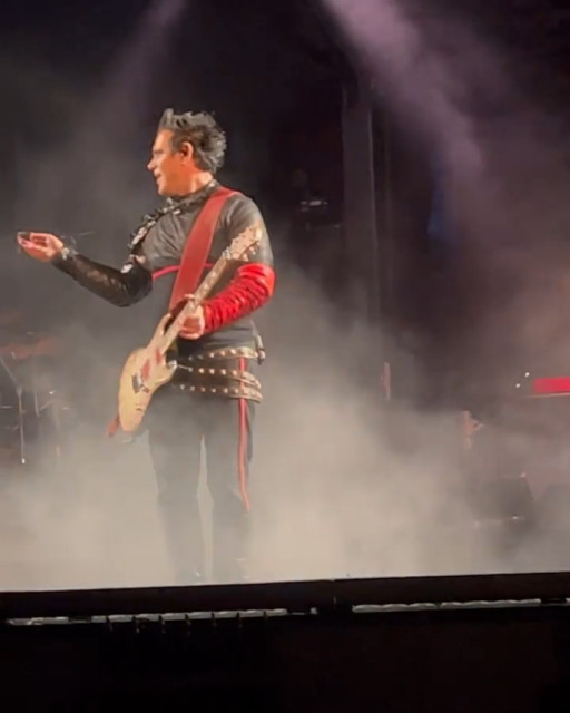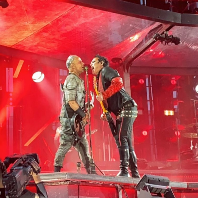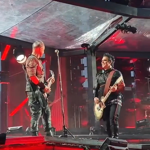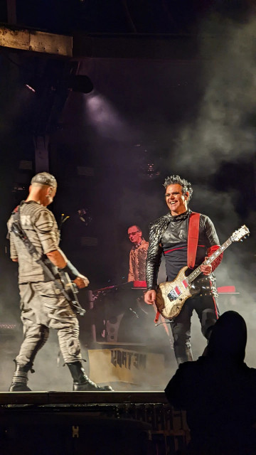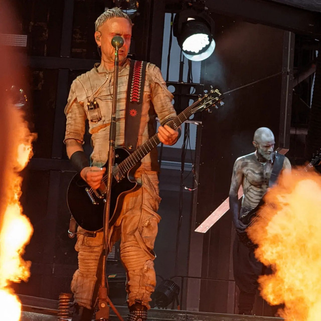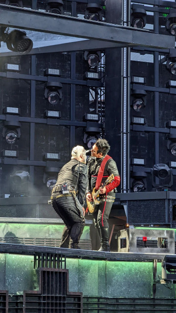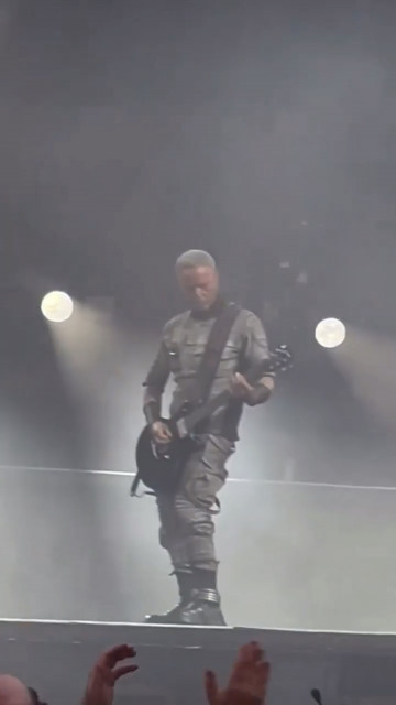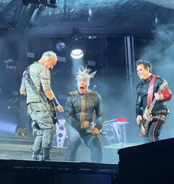Гітаристи на поклонах. Дама нічого не хоче зробити із застібкою своїх штанів? Штани розстібнуті, рукав падає. Прикметно, що дама вже давно перестала підтягувати рукав, у неї геть пропали такі характерні жести туру-2019 і початку туру-2022, коли вона постійно підтягувала рукави, герр навіть перекривлював її. Дама змирилася зі своїми рукавами і дозволяє червоному тіліпатися на лікті.