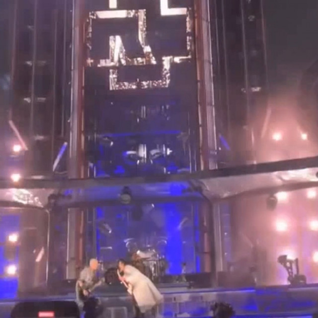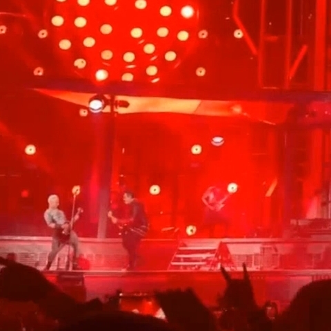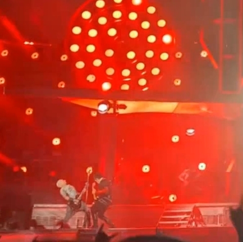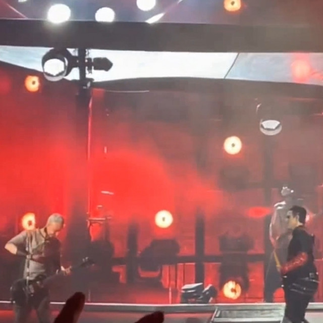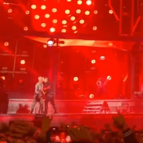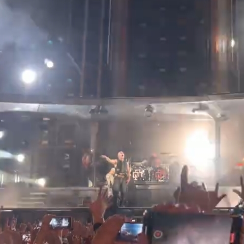 Гітаристи разом фініширували Адью – підійшли до барабанів як звичайно, але потім зійшлися впритул. Проте за спиною Тілля не видно подробиць, і знято дуже здалеку.