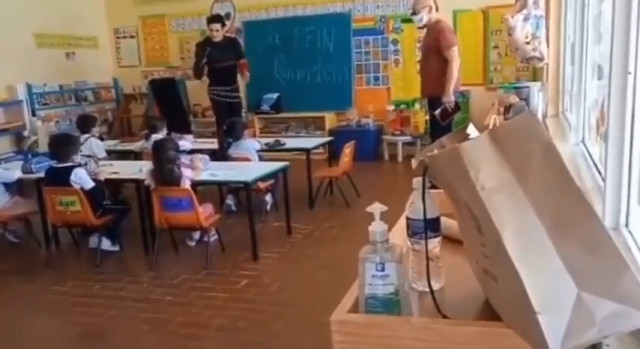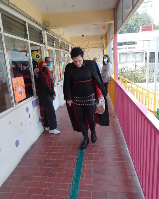 Яке ж гарнюнє це сонечко. І як абсолютно чужерідно він виглядає у шкільному коридорі, це справжнє створіння з іншого Всесвіту, цей плащ занадто сильно підкреслює надприродну сутність Ріхарда Круспе. Цікаво, що у кульку в руці Ріхарда, цей кульок стояв на столі в класі.