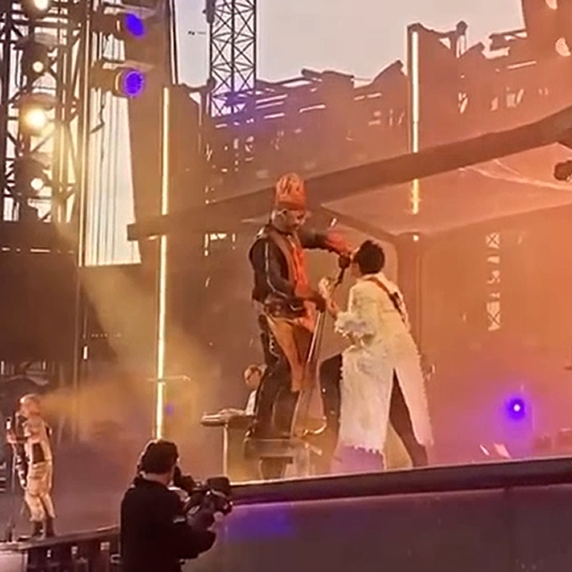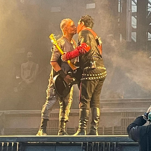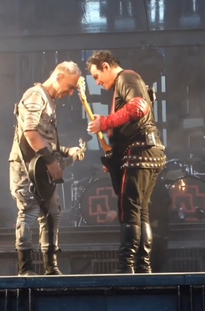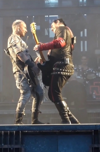 Повне МТ https://youtu.be/n1fcgxZ8_LY герр нащось спустився у підсобку. Дама традиційно сходила пограла з Оллі. Тілль, йдучи з правого флангу на центр сцени, затримався біля підставки Ріхарда, виліз на підставку і став підставляти Ріхарду свій мікрофон. Знову це виглядає мінетообразно. Ця дама і її ротик. Цей ротик був занадто активний. Якщо у дами в той день всі думки були про оральні забавки, то зрозуміло, чому на ранок у герра вигляд, наче з нього висосали всі сили, а вночі він постив поцілунки. На другому поверсі гітаристи орали йааа – причому дама орала багато разів. Відео зняте з трибуни напроти сцени, і на тих трибунах добре чути дамине йааа. Герр після її криків став бігати https://www.instagram.com/p/CfJOi64DCjx/