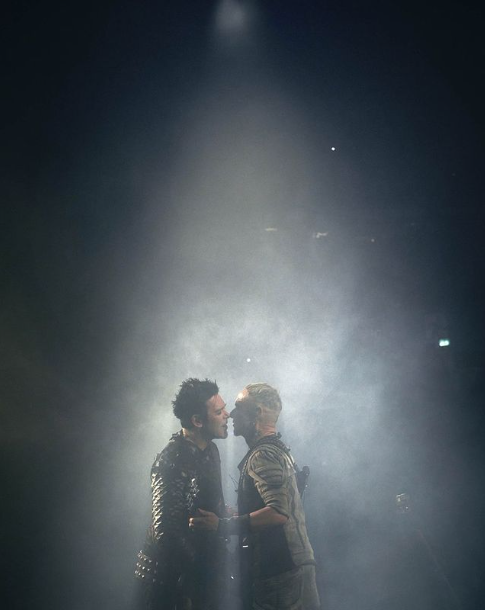 Ааа, от до чого були поклони гітаристів перед куссом! Паулю сподобалася видумка Ріхарда з намасте, і вони продовжили робити це на Аусландері. Після чого перейшли до камасутри і поцілувалися таким засосом, що дама навалилася на герра. На цьому гітаристи не угомонилися, вони стали гратися гітарами, а герр ще й розказував щось дамі. У Орхусі Тілль таки не витерпів і розігнав гітаристів, коли загорілося зелене світло. Якби Тілль не приперся до них зі своїм довбаним дзвіночком, то гітаристи й далі б стояли гомоніли.