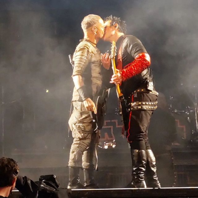 Аусландер. Тілль зробив членомікрофон і підійшов до Пауля –він не тільки чіплявся до Пауля, а ще й щось казав йому. Проте гітаристи як завжди не зважали на нього. Вони зійшлися, дама підступила дуже близько, вона вторглася в особистий простір герра і нависла над ним. Дамі захотілося уваги публіки, тож вона повернулася до залу, і герр слідом за нею. Коли публіка була достатньо заведена, гітаристи смачно із засосом поцілувалися, поцілувалися так, що вона відліпилася від нього з відкритим ротом – після чого вона захохотала і показала йому язика. Свого довгого язичка. Як можна жити з такою дамою, у неї ПМС чи що: то вона орала в припадку, то вона ніжно цілувала, тепер вона дражниться язичком.