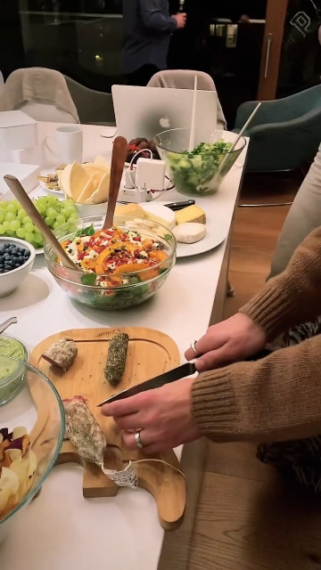 На диво багато їжі приготовано, якщо згадати, як кормили гостей у минулі рази – то щедрість Круспе прям безмежна. Хоча якщо порахувати тарілки – то стоп, їжі якраз із типового розрахунку Раммштайн «одна хлібина на двох людей». Тим більше, що на столі більшість тарілок – це помідори. Ріхард зібрав такий натовп, що внесли другий стіл від басейну. На одному столі 9 тарілок, припустимо, що стільки ж на другому столі – отже, 18 осіб. 5 Круспе, мексиканка, 3 Лукасів, Ді Рідо, Мерайка, хтось ще.