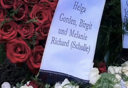 Мелані опублікувала фото могили. Червоні троянди, білі троянди… У букет вплетено білий рушник. На другому кінці рушника імена членів родини Тордіс, сестри Ріхарда, а тут імена вдови, членів родини Гордена і Ріхард. Сам Ріхард. Нема поруч імен його дітей, діти Ріхарда не вшановують пам‘ять дідуся. Я ні в якому разі не засуджую їх, вони були чужими все життя. Але серце розривається від цього свідчення, як батьки Ріхарда розбили життя не тільки Ріхарду, а й на його дітях позначилося це. Діти повинні мати дідуся й бабусю, ніхто не повинен бути таким одиноким, як був Ріхард. Боляче бачити його одиноке ім‘я на рушнику. Ріхард-Шолле. Для родини він Шолле. Саме Дітер придумав це прізвисько. Я все думала, як же батьки називають Ріхарда, чи прийняли вони його обране ім‘я - от і відповідь. Для брата він Шолле, для батька.