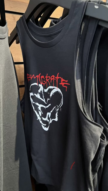 Нова колекція Емігрейт, заради якої й був влаштований захід. На вішалках висять худі як у Кіри, майки без рукавів з цікавим дизайном. Серце, воно ж обличчя?