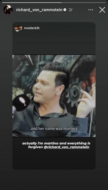 Mar. 23rd, 2023 12:28 amРіхарде… дожилися… Ріхард фон Раммштайн постить сторіз дівахи з-під сцени… яка стверджує, що вона перше кохання Ріхарда, тоді як за віком в дочки годиться зацілованій Мартіні. Цікаво Ріхард вечір проводить, півдесятого запостив сторіз.