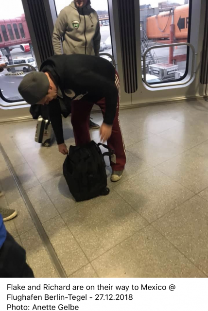 Кілька років гадала, звідки це фото, і от, нарешті, знайшла його з підписом. Ріхард летить на мексиканські новорічні концерти. Мужик позаду нього – це брат Ріхарда. Ріхард не любить подорожувати сам, йому постійно потрібна компанія. Хоча на ті мексиканські концерті й інші раммштайни брали членів родини, Шнайдер з Ульрікою був.