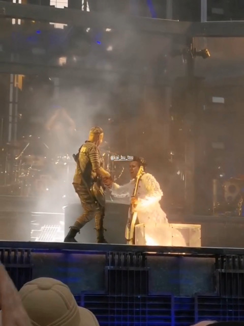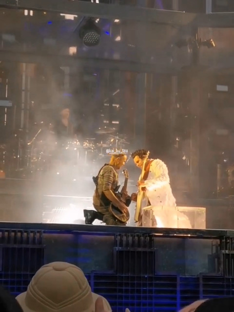 Бляяять, я коли це дивилася, то просто криком кричала: що вони роблять?! Дама знову змінила місце для забавок на МТ. За барабанами їй уже не цікаво, вона захотіла ощасливити синтезатори. Бідний Оллі, не дала вона йому там ховатися. Вона гралася з герром, пародіювала герра, а потім гітаристи стали водити хороводи. Господи, бачити Ріхарда таким веселим – це щастя. Оллі не став брати участь у таких жартах, а от Шнайдер прибіг https://www.instagram.com/p/CuxblxKJAIM/