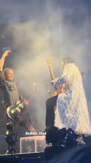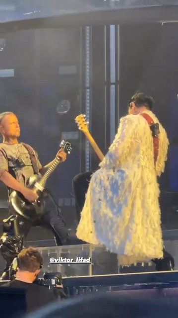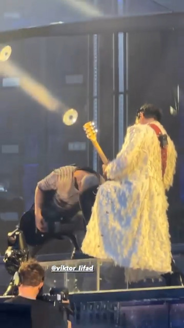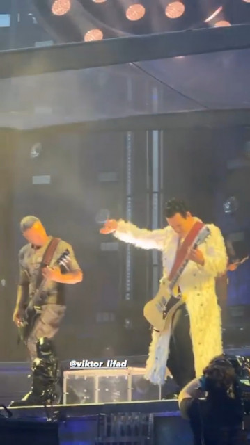 На МТ абсолютно нічого не було, і причина тут – стан герра. Краще б він окуляри не знімав, ясно видно, що в нього очі скляні. Гітаристи стали по обидві сторони підставки, потім повернулися – дамі сподобалося розтяжку показувати. Герр поклони їй побив, як він при цьому на ногах встояв. Наостанок дама сама свою кнопочку тіліпала, герр не поліз до її гітари – правда, дама її і не подала. Може, дама не хоче ще один набір зубів мати на гітарі, вона свої гітари любить, а від герра в такому стані що завгодно можна чекати. Проте дама посміхалася герру, а він посміхався їй – на всі свої 32 зуби, які вона не дала залишити на гітарі https://www.instagram.com/p/Cu2nVhRNbYi/