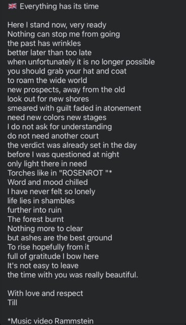 Н-да, нова поема Тілля відповідає тому, як він виглядає зараз. Англійський переклад, добавити тут нема чого.