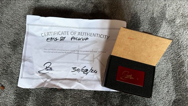 Sep. 10th, 2024 04:57 pmРіхардовий пікап з Richard Z. Reverb Shop купив граючий фанат thecoronamortis, який сьогодні виставив фото отриманої покупки. Хто так пом’яв сертифікат – пошта чи Ріхардові техніки? Що найважливіше на цьому фото – зразок свіжого почерку Ріхарда. Бо для браслетиків він заздалегідь пачку сертифікатів виписав, вони не є показником поточного стану Ріхарда, а от тут – актуальне. Писав Ріхард неакуратно, швидко і взбалмошно. Не здивуюся, якщо Ріхард сам пом’яв папірець, при такій каліграфії. Що дуже дивно – за день до виписування цього сертифікату Ріхард підписував Кемпери для продажу, і там його почерк дуже красивий, старанний. Настрій Ріхарда стрибав у ті дні: то він сконцентрувався й серйозно віднісся до роботи, то його думки помчалися кудись вдаль, і маркер вслід за ними.