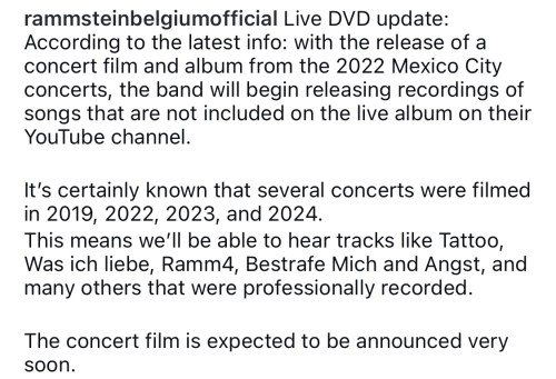 Те, що протягом усіх стадіонних турів концерти записувалися – це беззаперечний факт. Також є безславно викинутий Віденський ДВД 2019 року з двома повністю заснятими на багато камер концертами. Так що при бажанні публікувати можна безкінечно довго. Було б бажання. Може, зараз таке бажання дійсно є. Але Раммштайн сумно славиться тим, що їхні бажання швидко зникають разом із планами. Нам лишається одне – чекати. І сподіватися, що дійсно реліз концертника буде скоро.